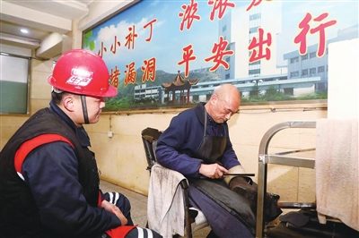 剪刀、胶皮、锤子、胶水、帆布手套……各种修鞋用具加起来几十斤重,65岁的李玉和背起来颇为吃力。但是20年来,他扛着这套工具不论风吹日晒、寒冬酷暑,始终定格在井口,义务为矿工兄弟们修补了数千只雨靴。“我也就这点手艺,能为矿上做点力所能及的事,心里踏实。”李玉和笑着说。