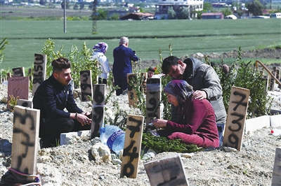 哈塔伊省的安塔基亚市是本次地震中受损最严重的城市之一。假期第一天,众多安塔基亚市民前往墓地悼念遇难亲人。他们在亲属墓前摆上鲜花,默默祈祷。在一片墓地,记者看到一名中年妇女跪在一座石碑旁,掩面哭泣。墓碑上的碑文刻着遇难者生于2007年1月7日,卒于2023年2月6日。她16岁的女儿在地震中不幸遇难。
