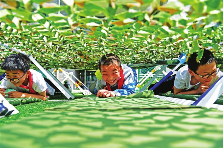4月27日,松庄小学举行“强国防、铸军魂、向未来”军事教育活动。匍匐前进、军事投掷、蛇形跑等特色项目,将国防教育与体育运动有机结合,让孩子们在强健体魄的同时厚植爱国主义情怀。 米国伟 摄