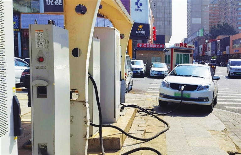这是记者4月27日在桥头街拍到的图片。一辆新能源汽车在充电站充电时,为图方便省事,居然停在斑马线上充电。如此随意停车,妨碍他人通行,实在不应该。申 波 摄