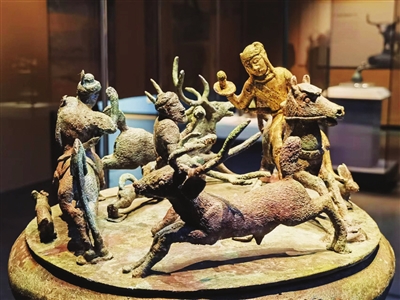其中一件西汉叠鼓形狩猎场面铜贮贝器,出土于云南晋宁石寨山墓地,雕铸的是滇族的一个狩猎场面。它由两个铜鼓叠置改造而成,器盖上铸有三位滇族武士,两人骑马,一人徒步,两只猎犬相助,武士持长矛追逐猎捕两只鹿、一只狐。骑马者之中一人通体鎏金,格外醒目;各类动物呈奔跑状,动感十足。形象塑造逼真,刻画准确到位。