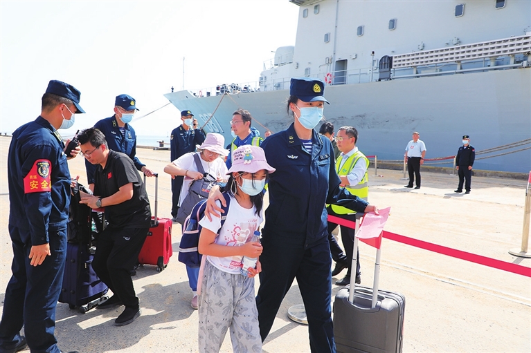 当地时间4月28日,从苏丹撤离人员在任务官兵引导下登舰。当地时间29日9时许(北京时间29日14时许),在中国海军导弹驱逐舰南宁舰伴随护卫下,综合补给舰微山湖舰搭载着第二批我在苏丹人员272人,巴基斯坦、巴西等国人员221人,安全靠泊沙特阿拉伯吉达港。新华社发