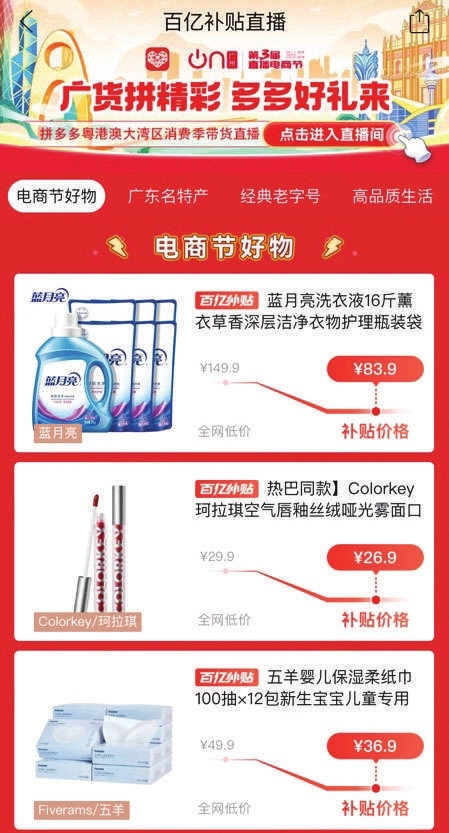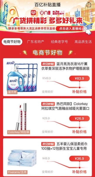 直播电商节活动期间,拼多多活动专区也于4月25日在客户端同步上线,针对化妆品、食品、洗护用品、服饰、家电等更多广东地区的优势产品及品牌,开启为期20天的补贴让利活动。消费者打开拼多多,搜索“电商节直播”便可一键直达。