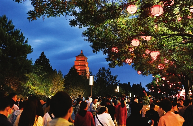 5月1日,游客在西安大雁塔文化休闲景区参观游览。“五一”小长假期间,人们来到各地景区游玩,乐享假期。