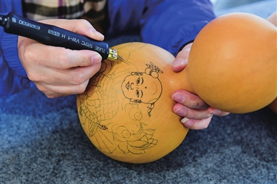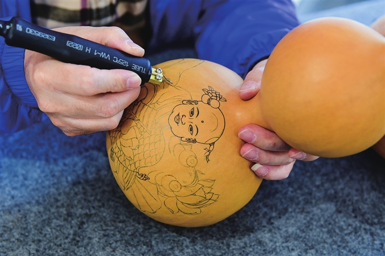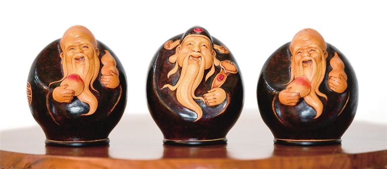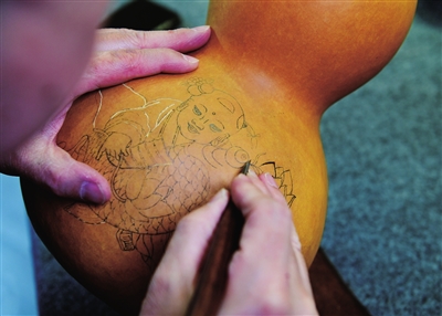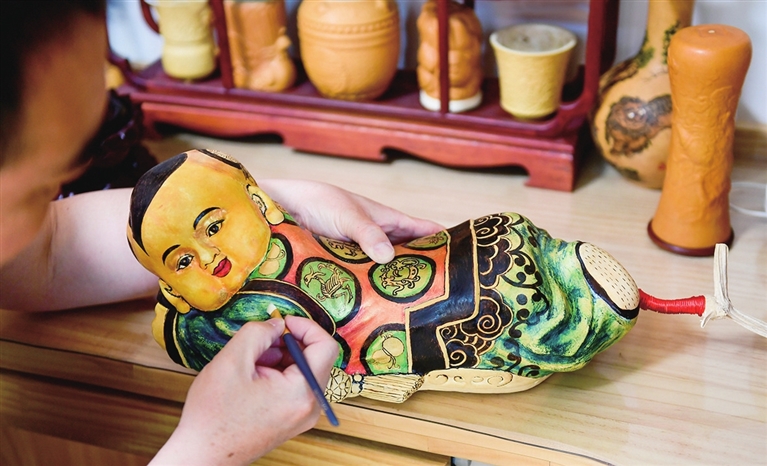 葫芦烙画工艺历史悠久,是传统手工艺的代表之一。匠人以葫芦为载体,以烙刻为手段,辅以针刻、彩绘、镂空、浮雕等工艺,注重“意在笔先、落笔成形”,突出“以铁为笔,以火为墨”的艺术特征。运用勾、勒、点、染、擦、白描等手法,烙出丰富的层次与色调,保持了中国传统绘画的民族风格。葫芦彩雕选用干透的适合图案造型的葫芦进行构图,运用浮雕、镂雕、浅浮雕、阴阳雕等工艺进行刻制,最后是上色、打磨、抛光……寻常的葫芦,在艺人手中变成了拙朴自然、高雅精美的艺术品。