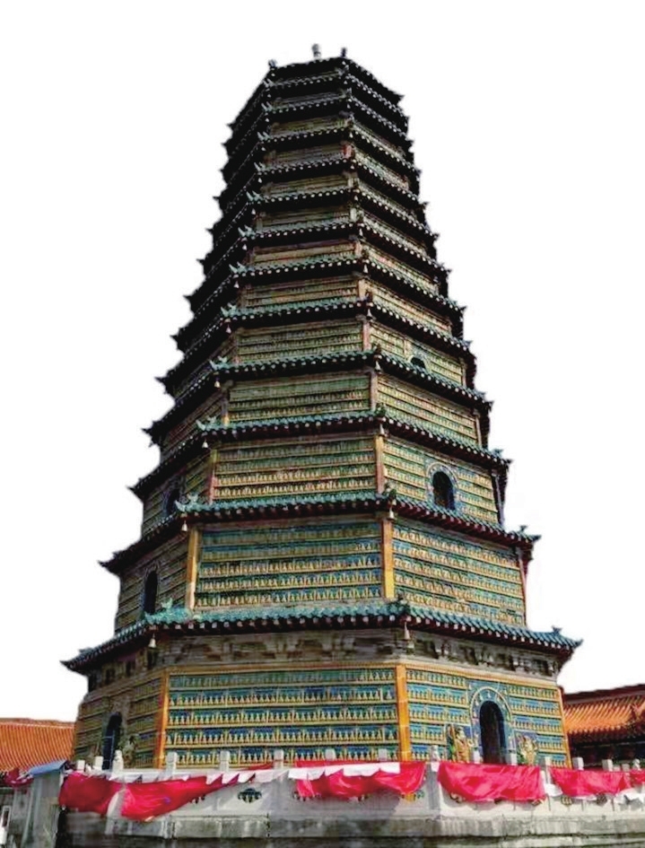 琉璃塔坐北朝南,平面呈八边形,十三层,高31.55米,占地面积36平方米。塔体外表皆以黄绿蓝三彩空心琉璃砖镶嵌,配有层层金黄色祥云,以黄色调为主的万尊佛像端坐其中。塔内由底层东门拾级而上,按逆时针方向围绕塔中心而上,顺梯可登至第九层。龛顶为八角形攒尖顶,由二十八层砖叠涩而成,顶刹在仰莲座上设风磨铜宝珠一枚,风力摩擦,光泽晶亮。
