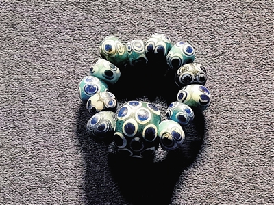 其中,最令人瞩目的是发现于山西太原赵卿墓的13颗“蜻蜓眼”。这13颗小珠子以浅绿色为底,大致呈球形,两端弧平,中间贯通一圆孔。珠子表面镶嵌白边深蓝圆点,酷似蜻蜓的复眼,整体来看制作精良,色彩绚丽,图案鲜明,光彩夺目,经历两千多年而颜色不衰,堪称珍宝。