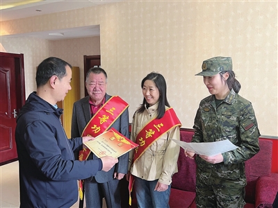 当天上午,在喜悦的锣鼓声中,一份喜报送到秦丽家中,大家向秦丽父母表示祝贺。迎泽区退役军人服务中心相关领导表示:“立功受奖喜报不仅凝聚着现役军人的辛勤汗水,也饱含着军人家属对国家和部队的支持和付出,感谢你们为国家和部队作出的贡献。”秦丽父亲激动地表示,孩子能有这样的成绩,感谢党和国家的培养、政府的关心和帮助。今后会继续全力支持孩子在部队安心工作,报效国家。郝庄社区党委书记于伟洋表示,立功喜报送进军人家不仅提高了军人与军属的荣誉感与获得感,也让军人家庭充分感受到党与政府的关怀。