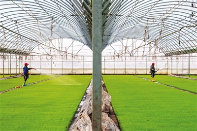 在辽宁省盘锦市太平凯地农机服务专业合作社,5000平方米的棚室内,2万多个规格统一的钵盘排列整齐,一株株水稻秧苗即将移栽到田间。