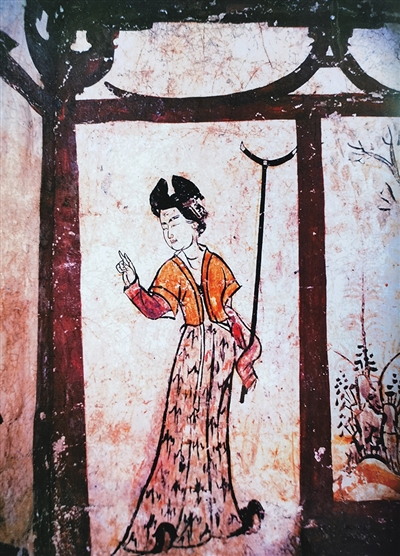 无独有偶,太原市文物考古研究所2019年在小井峪发现的唐代郭行墓中,也绘有一位动作相同的侍女。她头梳螺髻,身着襦裙,外披深红色帔帛,足蹬高头履,与金胜村唐墓中的侍女一样,右手也持一根“丫”形长杖,左手抬起比出一个V形的“剪刀手”。郭行墓是迄今为止太原地区发现的规模最大的唐代壁画墓,墓主人为唐代恒州刺史郭行,太原人,曾跟随唐太宗征战,92岁辞世。