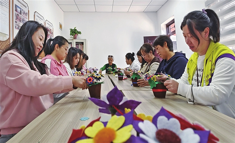 5月12日,迎泽区文庙街道山右巷社区开展“巧手生花,感恩母亲”主题活动,妈妈们在工作人员的指导下,制作创意手工花,装点生活。张昊宇 孙红梅 摄