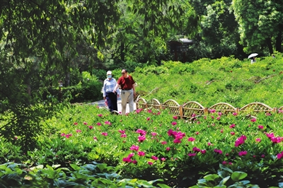 5月15日,迎泽公园牡丹园内,朵朵盛开的芍药花吸引市民前来观赏。张昊宇 摄