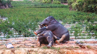 象群饱餐一顿,到了玩耍时间。它们转到一个鱼塘边,几头野象滑到鱼塘里“洗澡”,在水里不停翻滚,吓得鱼儿都跳出了水面。在岸上,有的野象把水桶踢着玩,还有的争抢水管当玩具……
