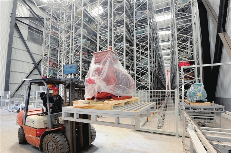 5月17日,山西电机制造有限公司立体成品库,工作人员正在忙碌。该成品库实现了智能化、机械化存取,可容纳电机成品一万台(套)以上。赵世凯 摄