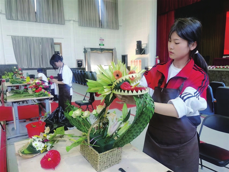 “我制作的这个作品名字叫‘龙舟浴芳兰’。”园艺专业二年级学生刘如意正在进行插花技艺的练习,她选用当季花材,以绿色和白色为主,拼插出一条“龙舟”,龙头造型栩栩如生,整个作品造型巧妙,寓意美好。在插花现场,太原生态工程学校20名学生进行了花艺创作,他们所制作的作品均别具一格,体现出不同韵味。在蔬菜嫁接现场,32名学生正在为南瓜苗和葫芦苗进行蔬菜嫁接,动作规范又娴熟,为提高植物的成活率打下了基础。据了解,园林、园艺技术是该校的传统优势专业,师生多次在国家、省级、市级职业技能大赛中取得优异成绩。(张晓丽 文/摄)