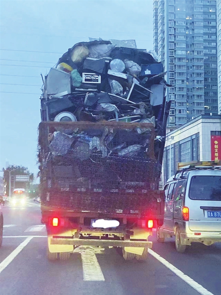 日前,一辆超高载货的货车在大同路由北向南的方向行驶,周围行驶的其他车辆纷纷躲避。市民王女士说,当时自己正驾车回家,突然发现前面出现了这辆装满废旧物品的“超高”货车。车上货物的装载高度有四五米,看上去晃晃悠悠的。货车后面的拦板也七扭八歪,感觉货物随时都可能掉下来。针对这样的行为,王女士呼吁交管部门严肃查处,消除道路交通安全隐患,确保广大交通参与者的安全。