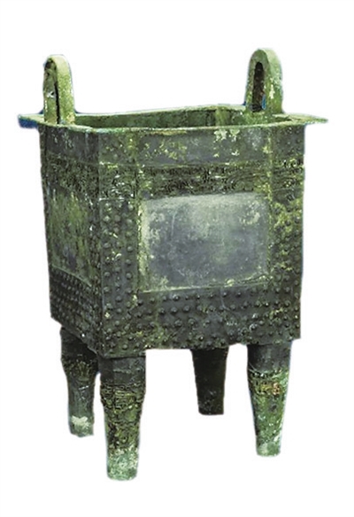 兽面乳钉纹方鼎(商代) 山西省平陆县坡底乡前庄村出土,口沿外折,方唇,沿面平直,附一对圆拱形立耳,耳外壁有凹槽,凹槽内饰三道圆拱形凸弦纹。
