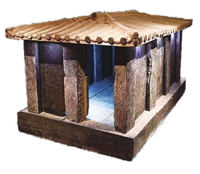 三彩女坐俑(唐代) 女俑面部白皙,脸圆润,细眼,高鼻梁,小口,头梳单高髻,戴项圈、手镯,右手握物,左手下垂,两足落地,穿云头靴,端坐在圆墩上。上身穿黄绿地短襦,胸臂裸露,下着黄绿色相间竖道百褶长裙,长垂曳地,上贴环形花。体态优美,面容俊俏,雍容华贵,婀娜多姿,展现了唐代女性的风采。石椁(唐代)