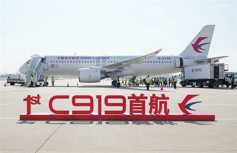 5月28日12时31分,经历1小时59分钟飞行,由C919大型客机执飞的东方航空MU9191航班平稳降落在北京首都国际机场,穿过象征民航最高礼仪的“水门”,标志着该机型圆满完成首个商业航班飞行,正式进入民航市场,开启市场化运营、产业化发展新征程。(更多报道详见第7版)新华社记者 丁 汀 摄