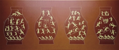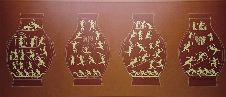 图案最底层为乙方乘船入侵;其上二三层为甲方调集兵卒上坡奔跑与乙方交战,并有甲方穿曳地长裙,用觚自壶中舀酒持之捧饮的场景,这可能是一种战争前的礼仪;第四层为交战图;最上层为甲方获胜后庆祝宴图。铜钫四面共有人物63人,其中甲方39人,乙方24人。