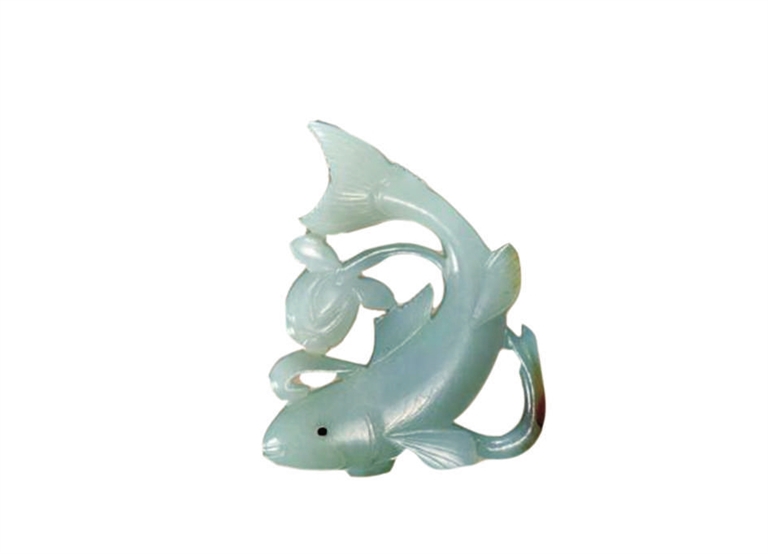 国家博物馆藏玉鱼莲巾环,白玉质地,镂空单面雕刻着一条弯状鱼,鱼尾上翘,跃然游动于莲荷之间。鱼身光素无纹饰,只有鱼鳍部分雕刻有阴线纹。一枝结着花苞的莲梗从鱼腹绕到鱼身上方,和鱼腹形成穿带大孔,系于头部巾冠之上,称为“冠巾饰”。鱼莲巾环寄托了人们金榜题名、高升昌盛的美好愿望。