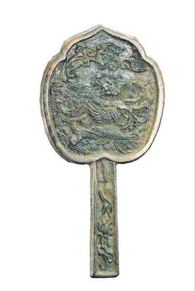 宿州市博物馆藏辽鱼化龙纹桃形执镜,鱼龙盘曲,呈飞跃状,左侧有一横置的堤坝,鱼跃过坝的头已变成龙,瞠目吐舌,头生短角,髻发飘卷,旁有云雾飘绕。坝下的身躯弯曲,分叉状鱼尾,脊鳍明显,周围有涡旋的浪花翻滚。整个镜纹表现了鱼化龙的过程,纹饰流畅,简洁生动。这令人想起中国十大古典名剧《琵琶记·南浦嘱别》中的唱词:“孩儿出去在今日中,爹爹妈妈来相送。但愿鱼化龙,青云得路,桂枝高折步蟾宫。”