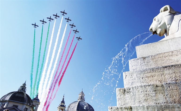 6月2日,意大利“三色箭”特技飞行表演队在罗马参加共和国日庆祝仪式。每年6月2日的共和国日也是意大利的国庆日。新华社发(阿尔贝托·林格利亚 摄)