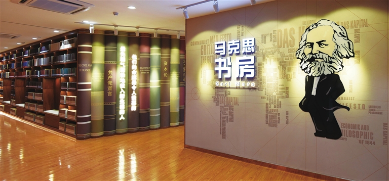 独具特色的马克思书房,集文献整合、空间叠加、功能融合于一体,收藏有马克思主义相关文献2.2万余册,划分为4个区域。展览展示区的马克思生平展览,有37幅和马克思有关的图片、油画,直观地反映了马克思和朋友们高尚的友谊,和妻子燕妮真挚的革命爱情,还有他在工人阶级中的所学所感所悟,听着工作人员对油画背景内容的介绍,马克思“顶风翱翔,逆水行舟”的印象尽映参观者眼底。