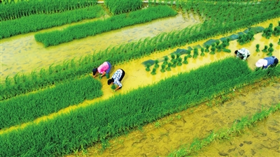 6月20日,在广西靖西市新靖镇其荣村,农民在起秧苗(无人机照片)。夏至将至,各地农民忙碌在田间地头,为秋粮丰收打下坚实基础。新华社 发 (赵京武 摄)