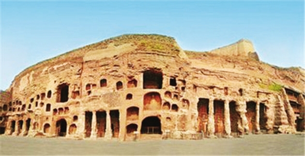 放眼望去,土灰微白的山冈,并不巍峨耸立。绵延一公里的山体石壁上开凿的洞窟,冬暖夏凉,温适体贴,幽深静谧,禅意深沉。