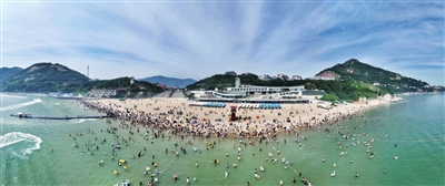 6月23日,游客在江苏省连云港市连岛大沙湾海滨浴场戏水纳凉(无人机全景照片)。端午小长假期间,人们纷纷走出家门,乐享假期。新华社发 (王 春 摄)