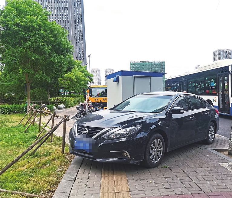 6月25日,一辆汽车停在新建路胜利街口公交车站旁的人行便道上,占压盲道,导致行人通行受阻,希望车主规范停车。李晓琳 摄