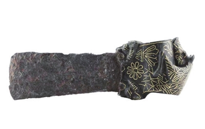 右下图的仪式用斧,发现于乌伽里特宫殿建筑群,藏于阿勒颇博物馆。斧的头部装饰有两头狮子和一头野猪,野猪前肢从斧头一侧露出;斧的刃部夹在两个狮子头部之间,狮子张开嘴,作出怒吼状;斧头表面镶嵌黄金,描绘了玫瑰花环图案,这可能是模仿埃及中王国时期的镶嵌装饰技术。