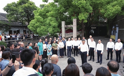 街边小广场上,曲乐悠扬,当地居民和游客正在欣赏苏州评弹表演。看到总书记来了,大家纷纷向总书记问好。习近平饶有兴致地同大家一起观看表演,他对大家说,昨天我看了工业园区,今天又看了传统文化街区,到处都是古迹、名胜、文化,生活在这里很有福气。苏州在传统与现代的结合上做得很好,不仅有历史文化传承,而且有高科技创新和高质量发展,代表未来的发展方向。他对当地负责同志讲,平江历史文化街区是传承弘扬中华优秀传统文化、加强社会主义精神文明建设的宝贵财富,要保护好、挖掘好、运用好,不仅要在物质形式上传承好,更要在心里传承好。