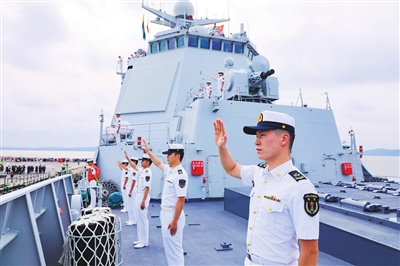 7月8日,中国海军第43批护航编队官兵向加蓬利伯维尔奥文多港码头的欢迎人群挥手致意。