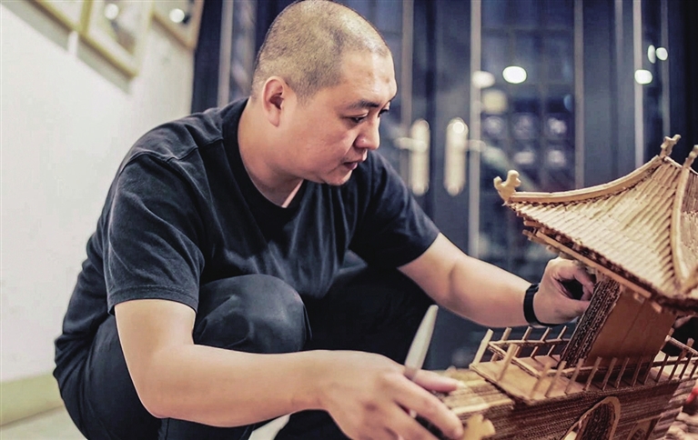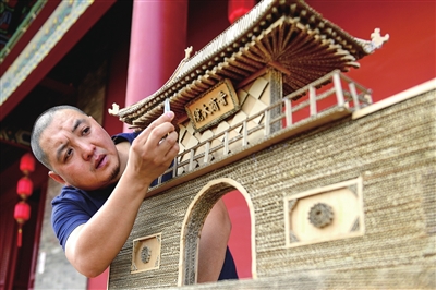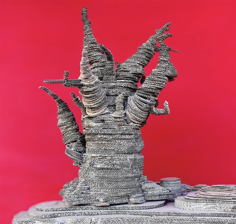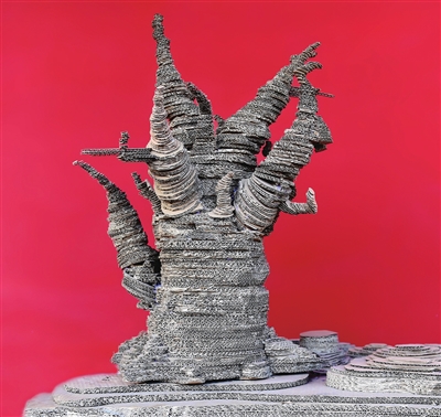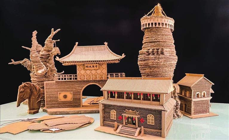 王帅栋创作的瓦楞纸作品,小到一棵树、一座塔,大到云冈石窟、晋商大院,每一件作品都细节满满,每一处接驳点都精致缜密,令人叹为观止。