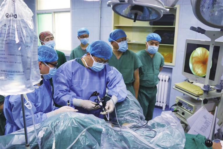 今年4月,太原市卫健委与同济大学附属同济医院签署战略合作协议。3个月来,同济医院共派出11名专家到太原出诊、手术、培训、带教、查房,服务患者216人次,开展三级、四级手术46台,让患者就近享受到高质量的医疗服务。图为同济医院泌尿外科主任吴登龙在市人民医院为81岁患者实施经尿道超大体积前列腺等离子剜除术。魏 勇 摄