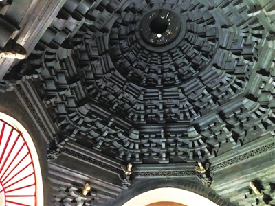 清徐尧庙尧王殿,相传是在帝尧“宫室”遗址上建造的。尧王殿重檐歇山顶,通宽五间,是一座元代创建、明代重修、清朝补缮的古建筑。系全国重点文物保护单位。 大殿内的藻井,没有常见用于支撑的柱子,也没有设天花板,无梁架结构,都以檐顶斗栱向里伸出,重叠五层,形成庞大的木构斗栱式藻井,故称“无梁殿”。这种“井盖型”设计,既可以将上层的梁架隐蔽起来,又可以作为神像的宝盖,设计十分巧妙,极富装饰趣味,是难得一见的大木作结合小木作缔造出的古建筑精品。
