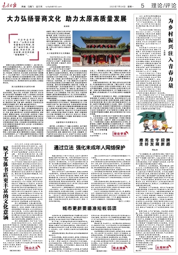 弘扬晋商文化的根本在于创新性发展与创造性转化。从历史到现实,从老一辈晋商到新一代晋商,根脉是文化,动力是创新。在新时代,晋商文化弘扬重在文化自觉,一方面要加强文化建设,继承晋商优秀文化传统,创新晋商人文精神,推进晋商文化创新性发展;另一方面要加强晋商文化创造性转化,将晋商文化与新时代思想有机结合,寻找其中的契合点,激发新晋商干事创业的文化自觉,助力太原高质量发展。