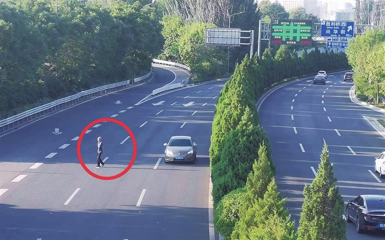 天气炎热,清晨去汾河景区锻炼的人更多了。7月25日,记者在滨河西路兴华北街口附近看到,有人步行横穿快速路,十分危险。张晓丽 摄