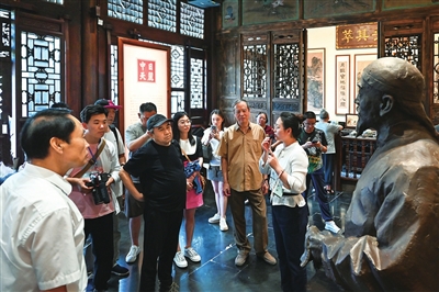 在晋祠,作家们观晋祠三绝,赏殿宇楼阁,品文化古迹。河北省作家协会副主席刘建东赞叹:“太原历史根脉很深,同时又是一座现代化城市,我深刻感受到了历史文化与现代文明的碰撞与交融。回去后会以文字记录下感悟。”