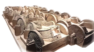 赵卿墓车马坑埋葬方式极为讲究。埋葬时,在车坑底部先挖好轮槽,埋入时将车轮嵌入槽内,车轴紧贴坑底。这种独特的轮槽设置,成为一种独创的埋藏方式,虽历经2500多年,车辆基础构件基本保持原形,各部件之间错位甚微,几乎所有车轮都保持正圆形。战马属蒙古马系,殉葬采取尸身紧靠、头顶一向、逐次排列的埋葬方式。这些马,头大、颈粗、躯干长、四肢短,平均身高148厘米。超强的忍耐力,使它成为马中极品,耐得住零下40度的严寒,在战场上勇猛无比,拥有难以比拟的速度、机动能力。