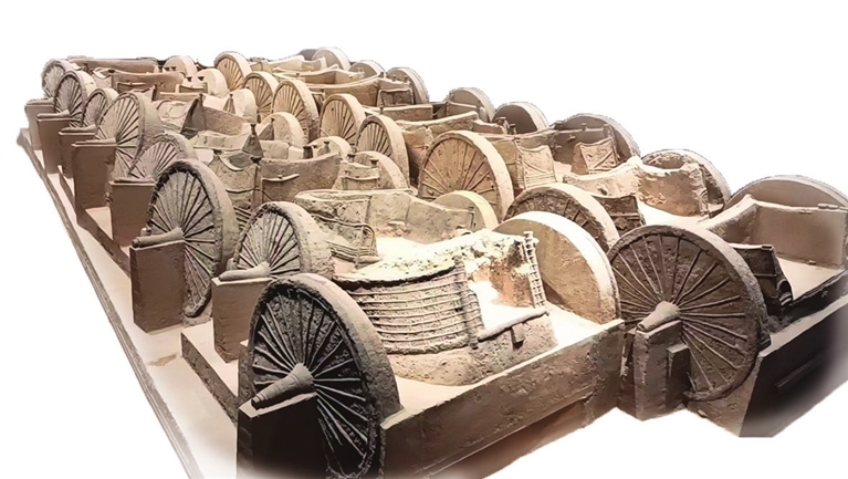 车马坑内之车均为单辕,双轮车轴之上附车厢。车为实用的木车,但木质都已腐朽。根据车舆形制差异,分为圆形舆和方形舆两种。圆形舆仅一辆,位于北边一列车的队首,位置显赫。这是出土的唯一一辆圆形舆车,专家推断,气派威仪如此非凡,一定是墓主人生前的专用座乘。3号车和8号车,用材厚实,车身宽敞,车毂有深篆并经胶筋加固,軓前设置鼓金立柱,舆后有帅旗旗座,这是指挥战车的标配,专家推测这两辆车是“戎路”——王者和诸侯所乘的军事指挥车。7号车和8号车的右侧轮舆之间,各有一只殉犬,殉犬颈有铜箍,应为猎犬,专家判定7号车是墓主人的猎车,尺寸虽略有缩小,却不减精致。