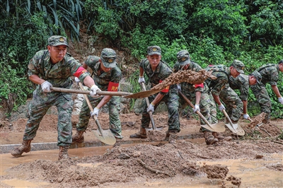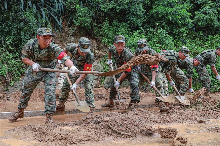 7月29日,陆军第73集团军某旅党员突击队在惠安县螺城镇梅山村附近乡道紧急处置山体滑坡,清理淤泥。