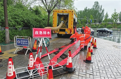 七月三十日,市政工人在滨河东路龙城北街口铺管,准备清排积水。 梁 琛 杨 斌 摄