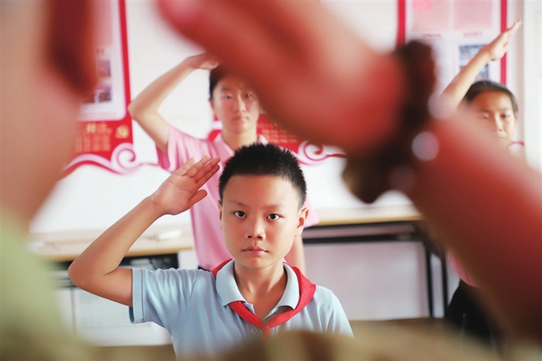 8月1日,桥东街道南巷社区开展“八一”国防教育主题活动。退役老兵现场教孩子们站军姿、敬军礼、唱军歌,激发孩子们尊军崇军热情,增强国防观念与爱军拥军意识。张昊宇 摄