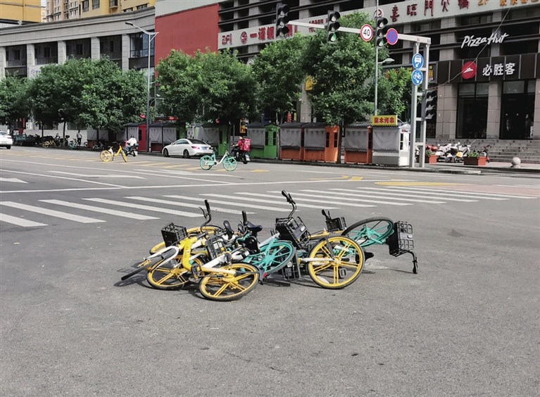 8月1日,在千峰南路新庄北街路口西侧,好多辆共享单车堆在一起,不仅占用道路,而且影响居民的出行。刘志刚 摄