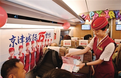 8月1日,天津客运段的乘务人员在京津城际列车上给旅客发放纪念册。当日,我国首条设计时速350公里高铁迎来15岁生日。从2008年8月1日中国首条设计时速350公里的高速铁路——京津城际铁路开通运营,至今已累计运送旅客3.4亿人次。新华社记者 李 然 摄