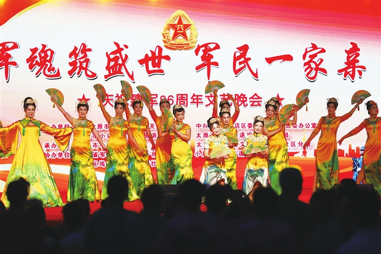 8月1日晚,小店区举办的庆祝中国人民解放军建军96周年文艺晚会在省军区太原第八干休所举行。此次演出展现了军民鱼水情和退役军人退役不褪色,坚定不移听党话、感党恩、跟党走的军人风采。张昊宇 张叶婷 摄