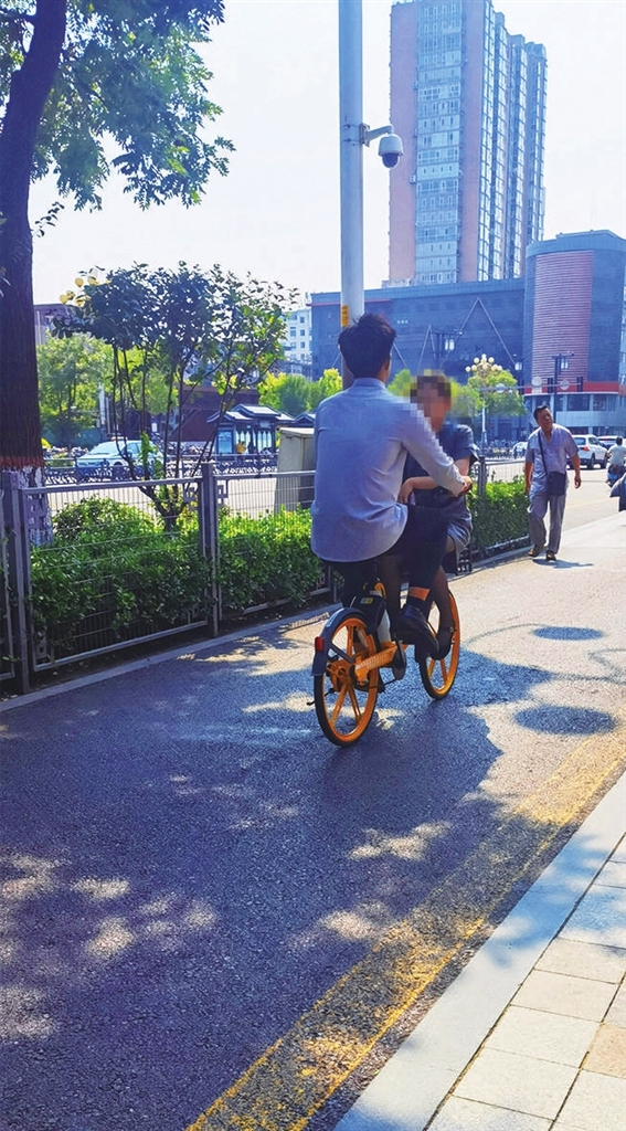 8月2日,记者在府东街见到令人吃惊的一幕,一名男子骑着共享单车,车筐上居然坐着一位成年女士,两人说说笑笑,飞快地前行,全然不顾危险随时可能发生。申 波 摄